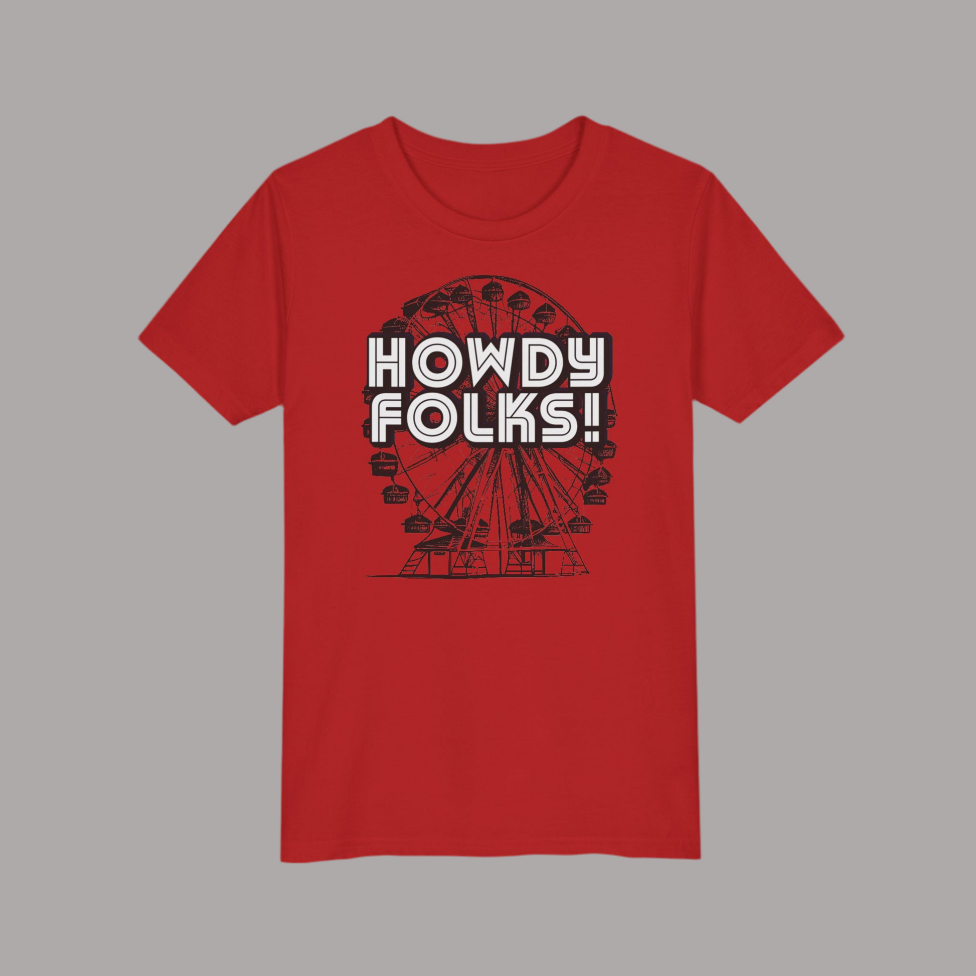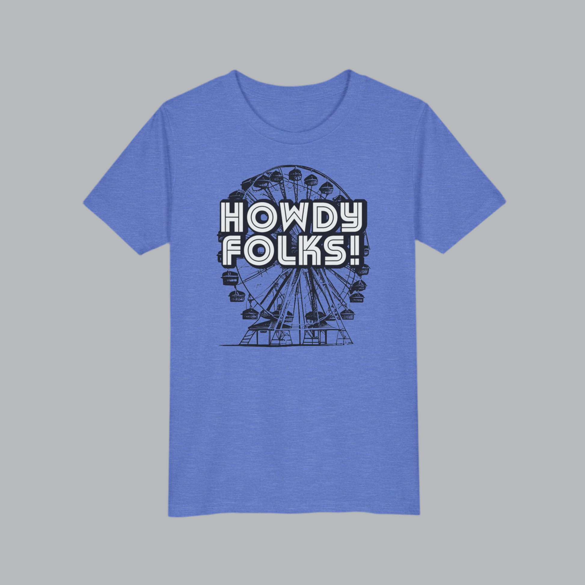 Howdy Folks State Fair of Texas Youth Shirt featuring a Ferris Wheel and Big Tex design. Perfect for family matching or group shirt outfits. Gives a fun and festive vibe, ideal for those attending the State Fair of Texas. Relevant for families, children, and fair enthusiasts. Great for State Fair visits, family outings, and group events.
