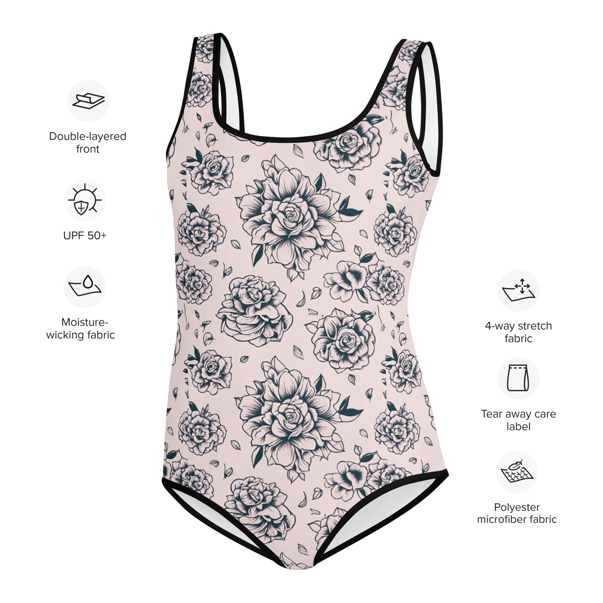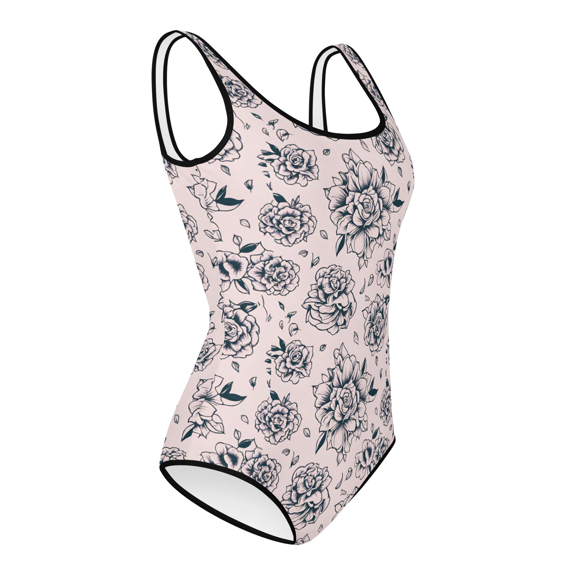 Vibrant Pink Tattoo Roses Youth Swimwear, Edgy Elegant Swimsuit for Girls, Comfortable and Stylish Size 8-20 Youth Swimsuit.