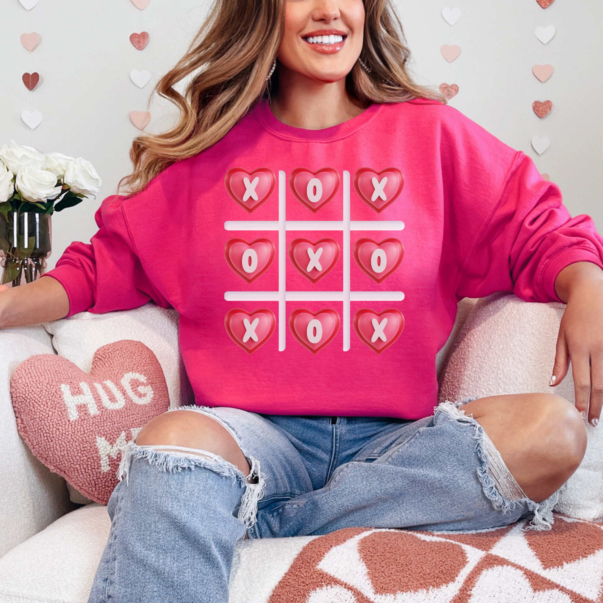 This xoxo tic tac toe ladies sweatshirt with 3D conversation hearts design in pink, hot pink or black is the perfect Valentine's Day sweater. It gives a cozy and romantic vibe, making it ideal for Valentine's Day celebrations and those who love cute and heartfelt designs.